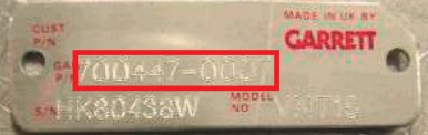 Die zweite Option für Garrett-Turbolader ist eine Metallplatte, die sich ebenfalls auf dem Aluminiumteil des Turboladers befindet. Hier ist die Nummer bereits an einer anderen Stelle platziert, hinter der GA P/N.